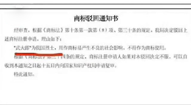 根据国家知识产权局商标局的证实,确实有这回事,理由也很简单。我国确实有一位叫武大郎的烈士,由此商标根据相关条件被驳也很正常。